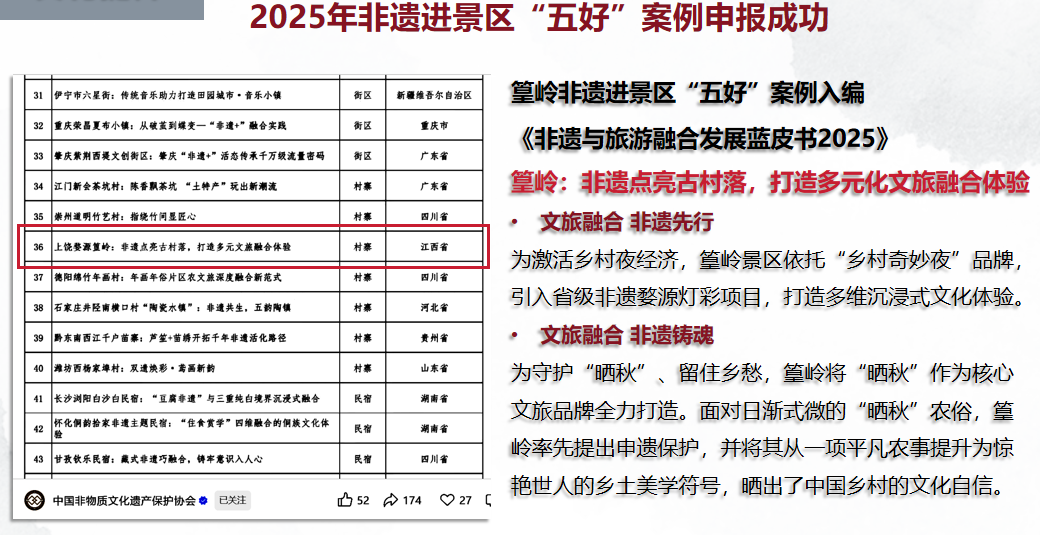 近日,篁嶺景區成功入選中國非物質文化遺產保護協會2025年非遺進景區“五好”案例。該遴選工作旨在推動非遺與旅游深度融合,挖掘一批集“好看、好吃、好聽、好玩、好用”于一體的典型案例篁嶺景區因其在非遺與旅游融合方面的積極探索,成功入選該案例名單。