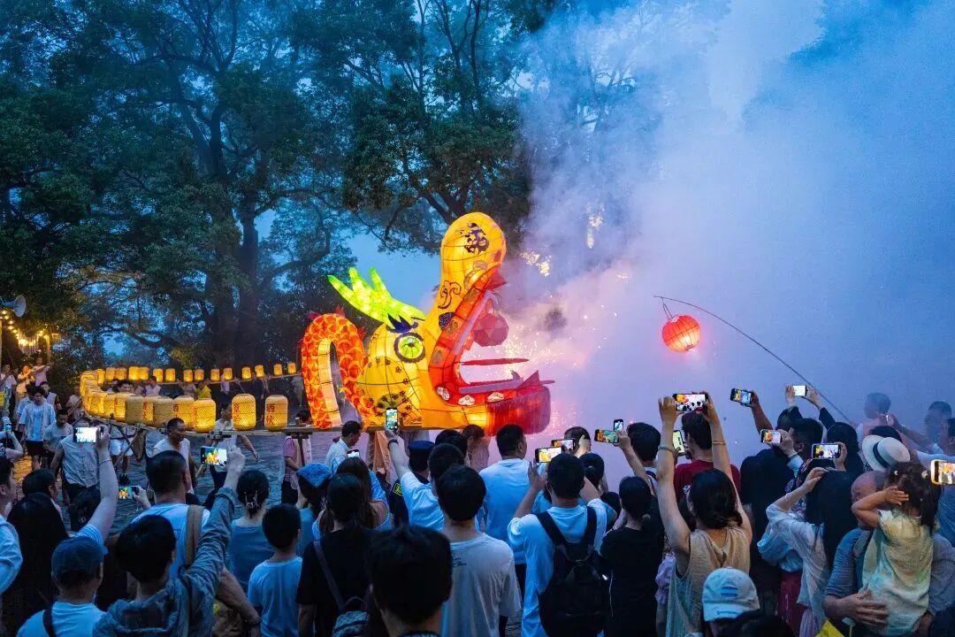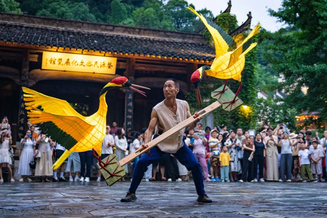 除了板凳龍燈,篁嶺還推出了紙燈舞仙鶴等非遺燈彩表演。以竹骨為架、彩紙扎制的仙鶴立于扁擔兩頭,燈彩師傅上下舞動間,仙鶴翩翩起舞,引得游人陣陣喝彩,仿佛穿越古今,與歷史對話