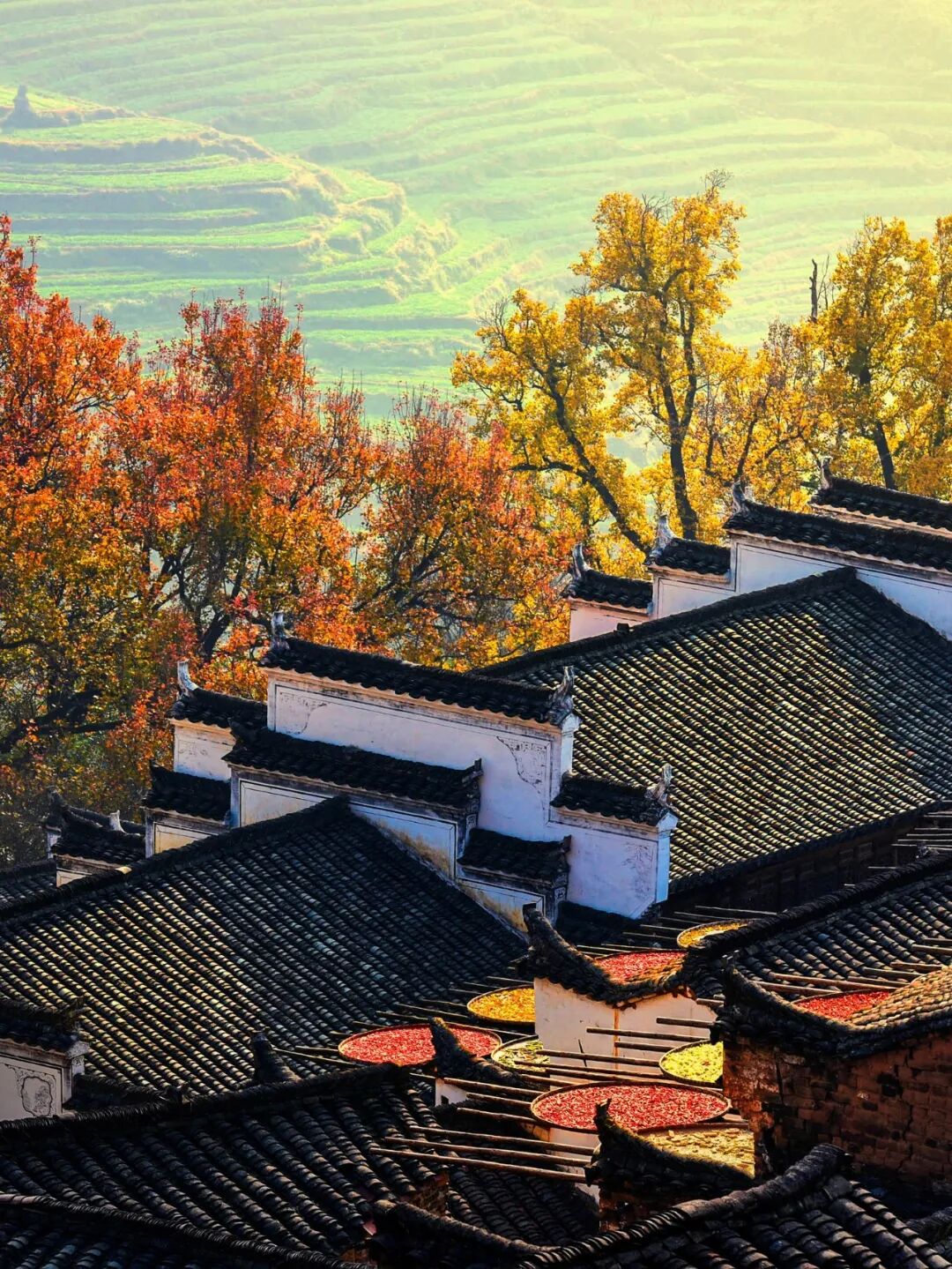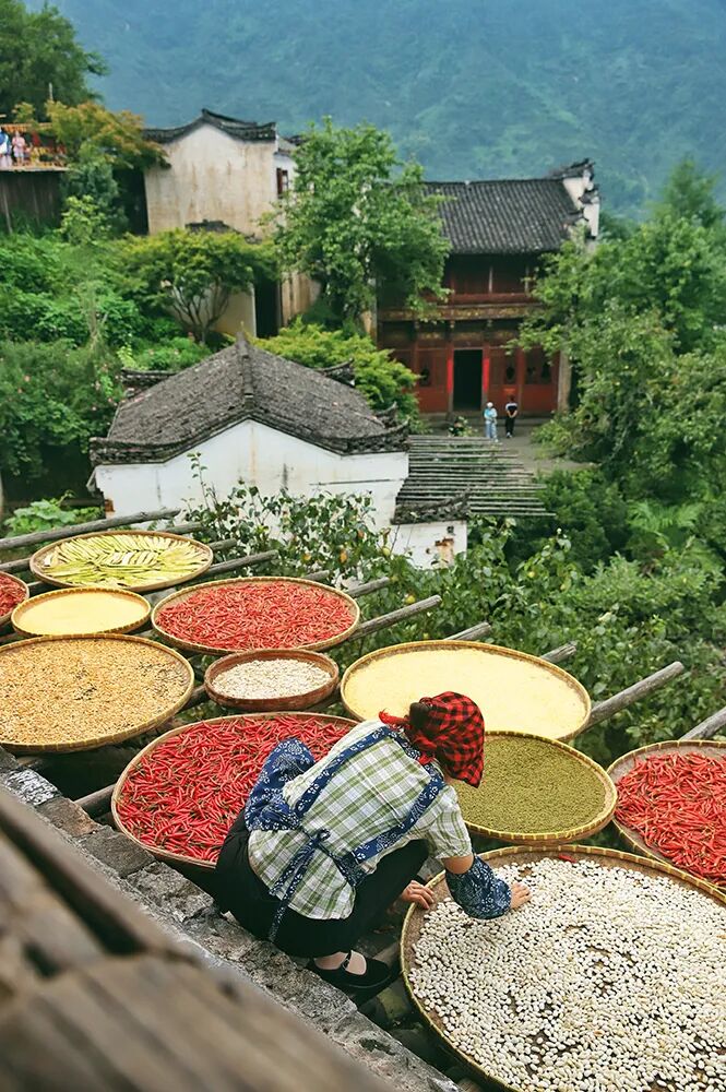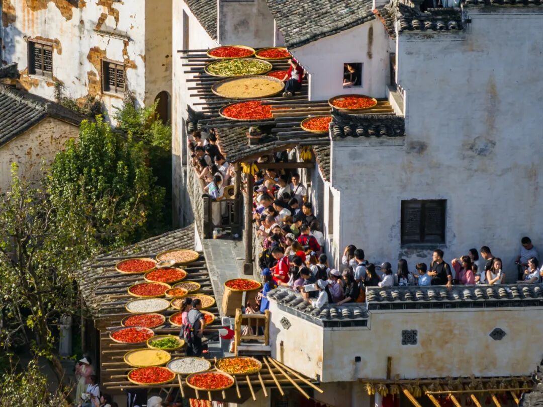 火紅的辣椒、金黃的玉米、橙黃的南瓜……各種豐收的果實,仿佛大自然被打翻的調色盤,錯落有致地點綴在粉墻黛瓦的徽派建筑之間。這不僅是村民們順應天時、儲存食物的智慧,也成了一幅流淌的、壯麗的田園詩畫。
