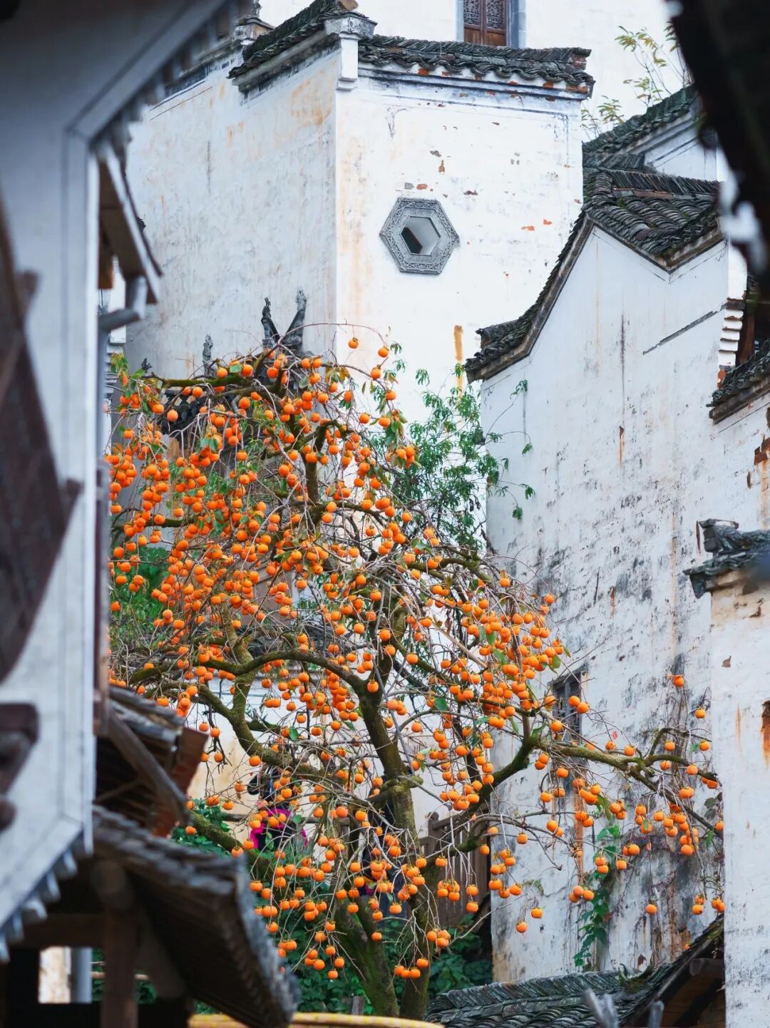 入秋后的篁嶺,除了曬盤里的五彩斑斕,更有枝頭間的喜悅。村內棵棵柿子樹上,黃澄澄的柿子像一盞盞小燈籠掛滿枝頭。它們與徽派建筑特有的飛檐翹角相互映襯,為古老的村落增添了幾分靈動的生命力。隨手拍下一張照片,都是一幅充滿韻味的風景畫。