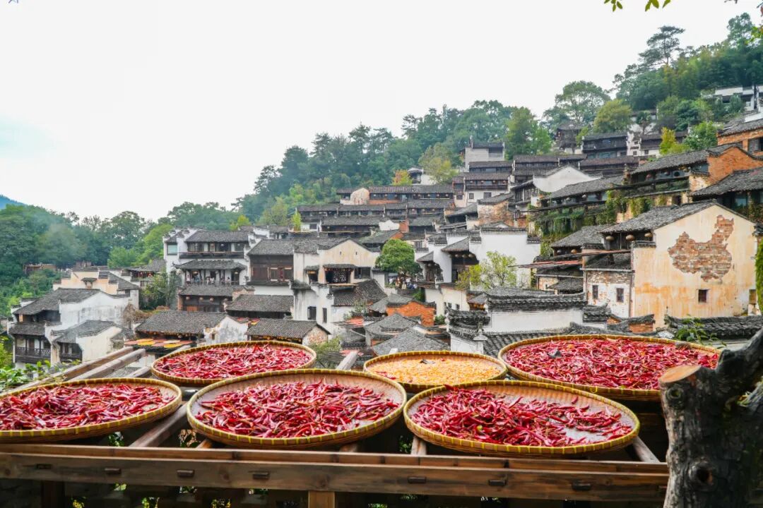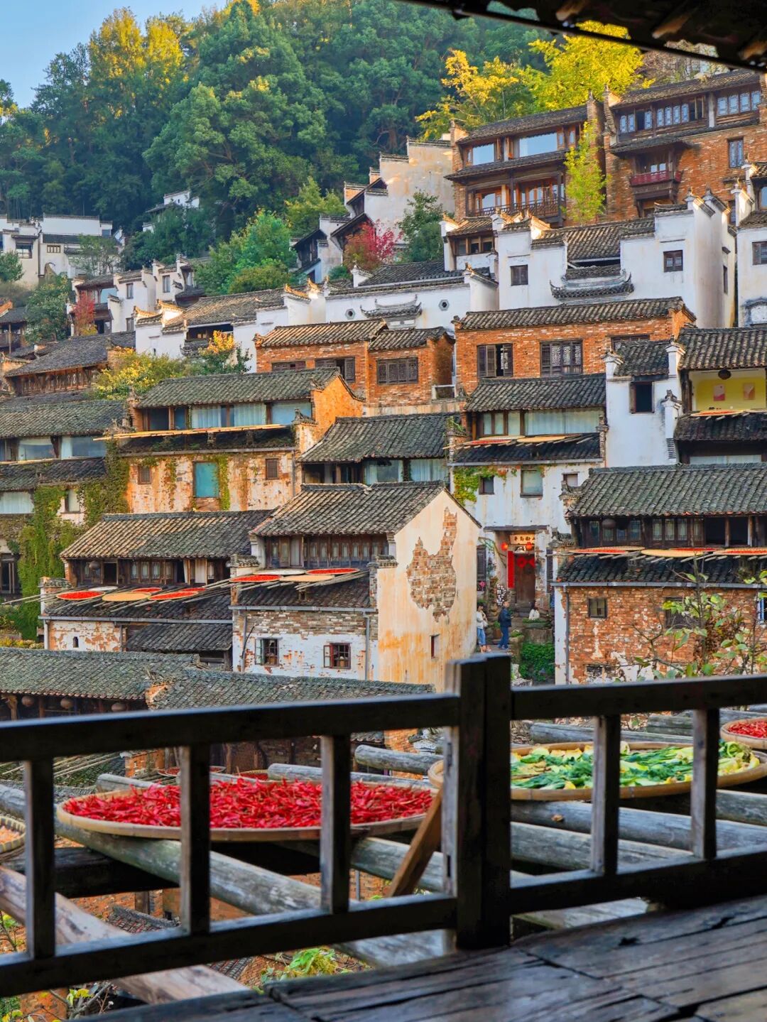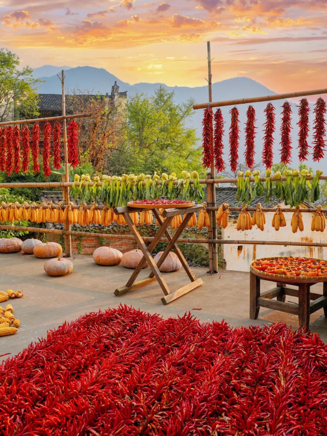 曬秋觀景臺是篁嶺古村視野最為開闊的打卡點(diǎn),能俯瞰古村曬秋全貌。家家戶戶的曬架、窗臺盡收眼底,紅、黃、橙等色彩交織,像打翻了上帝的調(diào)色盤,壯闊的曬秋盛景在此處展現(xiàn)得淋漓盡致。