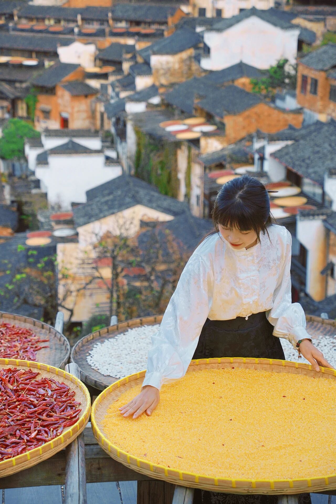 作為古村中心,這里是拍攝曬秋的便捷之地。觀景臺的曬,圓圓的曬匾裝著豐收的果實(shí),隨手拍都能展現(xiàn)曬秋的熱鬧。