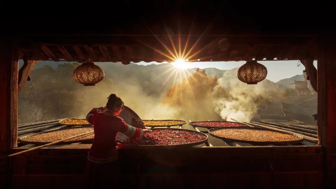 作為爆火的打卡點(diǎn),曬工坊的三層結(jié)構(gòu)各有特色。一層可近距離觀察村民晾曬皇菊等作物的過程,金黃的皇菊鋪滿竹匾,治愈又耀眼;二層窗臺邊常掛著串成串的紅辣椒,色彩濃烈;三層觀景臺視野開闊,能看見整個村落,怎么拍都經(jīng)典。