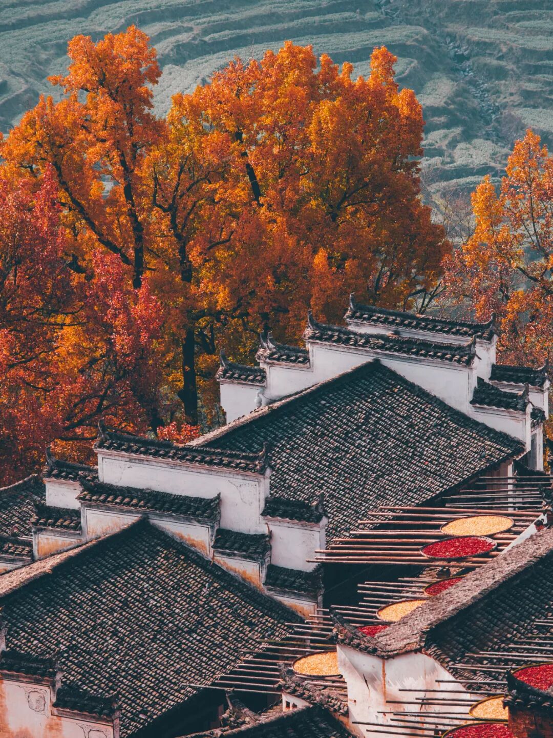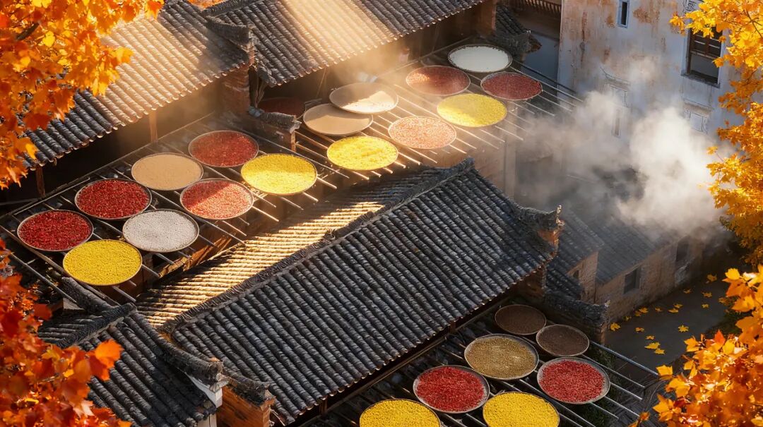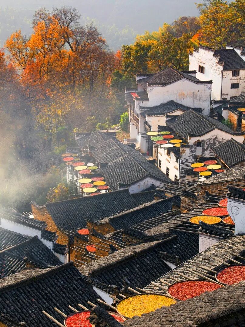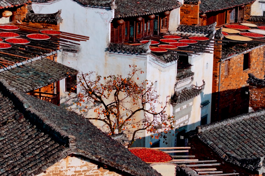 “四時俱可喜,最好新秋時”,篁嶺的秋天從不會讓人失望。一進(jìn)古村,最先撞進(jìn)眼里的就是曬秋——曬匾把崖上古村鋪成了調(diào)色盤,辣椒的紅,皇菊的黃,一層層搭在屋頂、掛在曬架上,風(fēng)一吹,連空氣里都裹著糧食的甜香