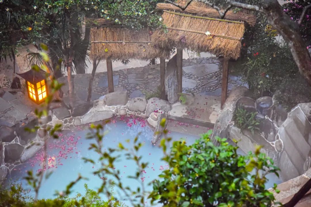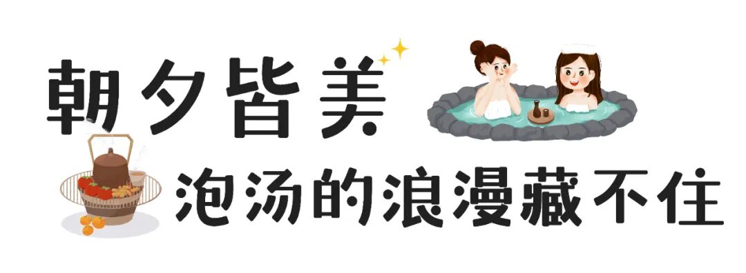 最讓人安心的是,湯池24小時都在循環(huán)過濾,每天還會補新水、做消毒,換一身松軟的浴衣坐進(jìn)去,不用有半點顧慮。溫?zé)岬乃^膝蓋、腰腹,剛才逛古村、踩落葉時攢下的倦意,像被溫水悄悄揉化了。