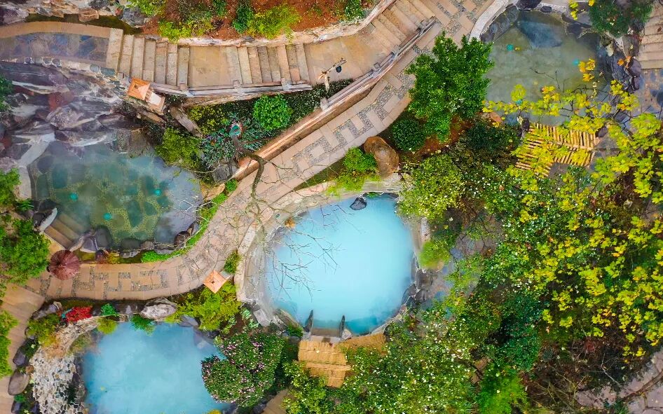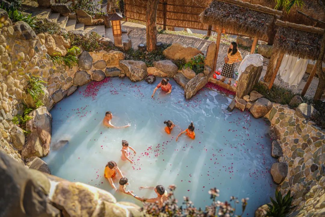這里的八個戶外湯池各有講究,愛美的選紅酒湯、牛奶湯,泡完皮膚都透著潤;想舒舒服服松口氣,就試試艾草湯、硫磺湯,暖意順著毛孔往骨子里鉆。