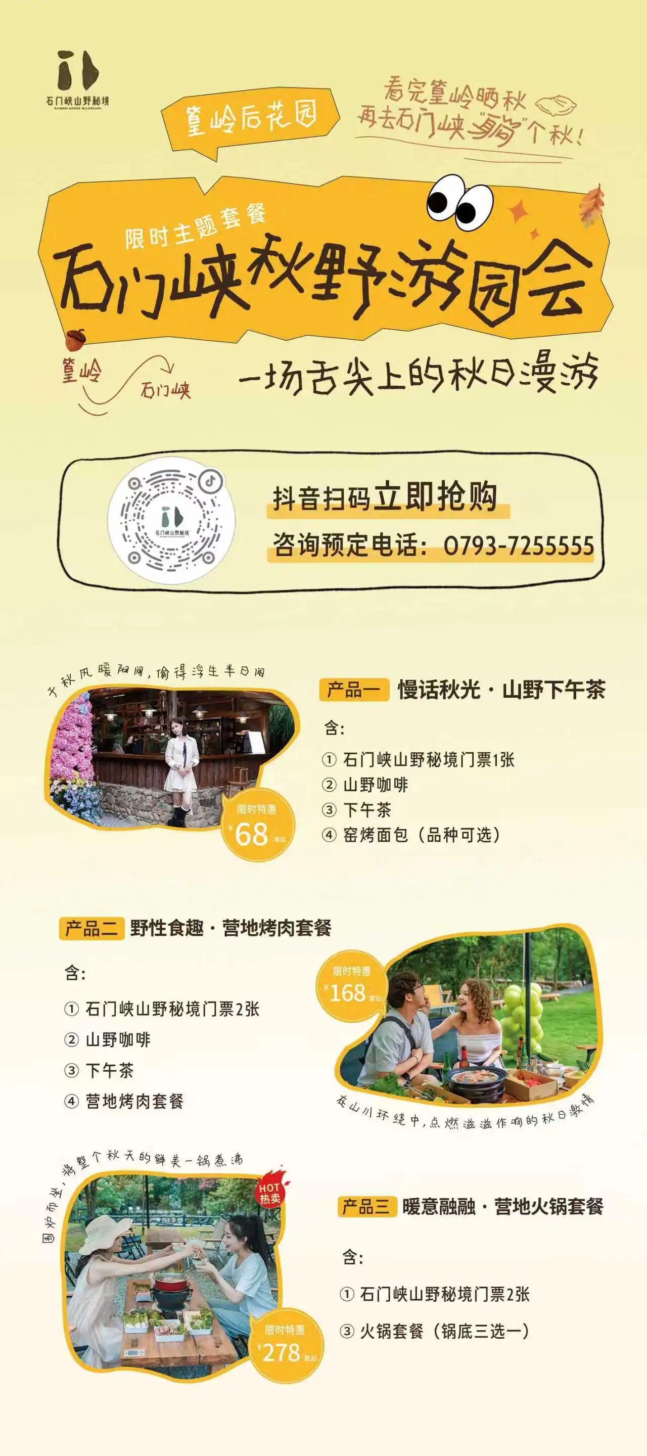 這個秋天,來篁嶺曬個秋,更要去石門峽“躺”個秋!秋野游園會特惠套餐68元起,趕緊搶購鎖定這份愜意,讓慢時光治愈所有疲憊~